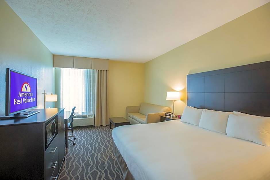 This accessible room features a bath tub, small refrigerator, and microwave.